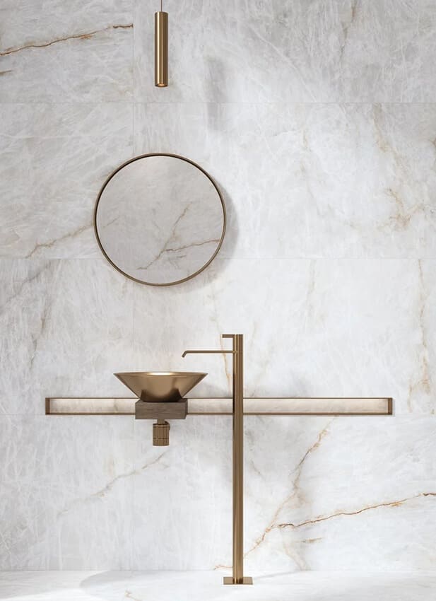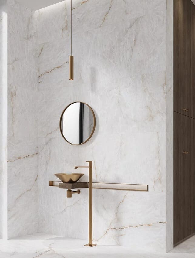 Luxusné gresové dlažby Cristal Champagne v krémových a zlatistých tónoch vo veľkoformáte. Elegantný vzhľad kameňa pre moderný interiér.