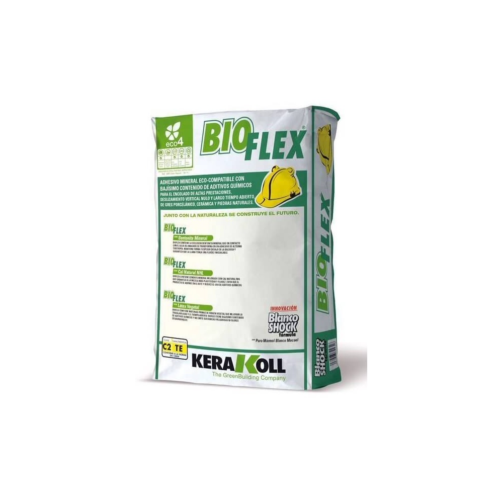 Kerakoll Bioflex lepidlo síve v 25 kg balení je mimoriadne ekologické, minerálne a gélové lepidlo s najnižším obsahom chemických prísad na lepenie obkladov a dlažieb, prírodného kameňa, keramiky, s nulovým vertikálnym sklzom a dlhým časom vädnutia. Bioflex lepidlo pozostáva z minerálneho cementu vylepšeného o prírodne hydraulické vápno, ktoré zabezpečuje jednoduchšiu manipuláciu a lepšiu plasticitu. Naviac obsahuje složky rastlinného pôvodu, ktoré zlepšujú zpracovateľnosť. Neuvoľnuje nebezpečné látky ani nepríjemné zápachy.